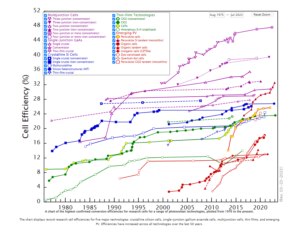 由NREL發(fā)布的全球太陽(yáng)能電池實(shí)驗(yàn)室最高效率圖,一直刷新著全球電池技術(shù)的最高峰值。NREL發(fā)布的這個(gè)圖,是“交互式”的互動(dòng)圖。你只要把鼠標(biāo)對(duì)準(zhǔn)每一個(gè)數(shù)據(jù)點(diǎn),就會(huì)自動(dòng)展現(xiàn)該數(shù)據(jù)的詳值,以及它的主人,所在機(jī)構(gòu)或?qū)嶒?yàn)室,具體的時(shí)間點(diǎn),甚至該數(shù)據(jù)背后的故事。